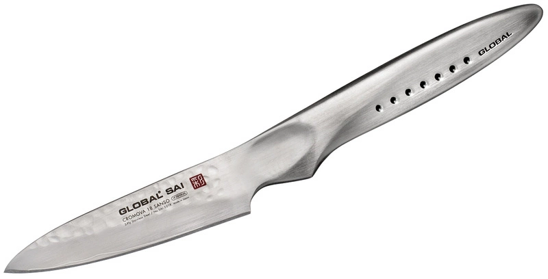 W klingach noży Global SAI zastosowano materiał CROMOVA 18 SANSO. Rdzeń ze stali nierdzewnej CROMOVA 18, o twardości 56-58 HRC, obłożono dwiema warstwami miękkiej stali nierdzewnej SUS410. Dzięki temu ostrze jest bardziej wytrzymałe i odporniejsze na pęknięcia, przebarwienia czy korozję. Płazy głowni posiadają ręcznie młotkowaną powierzchnię, która zapobiega przywieraniu produktów do noża. Grzbiet klingi jest lekko zaokrąglony, aby zwiększyć komfort pracy dłonią. Nowe, ergonomiczne rękojeści są doskonale wyważone, a innowacyjne wgłębienie na kciuk zapewnia lepszą kontrolę nad nożem oraz wygodę podczas pracy. Jednolita konstrukcja sprawia, że noże są higieniczne i łatwe w ostrzeniu.