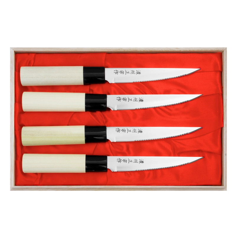 Komplet do serwowania steków łączy funkcjonalność tradycyjnego noża stołowego z nożem do porcjowania pieczeni czy wędlin. Jest to doskonały wybór dla pasjonatów mięs. Rękojeści noży zostały wykonane z drewna magnoliowego i zakończone pierścieniem z tworzywa.