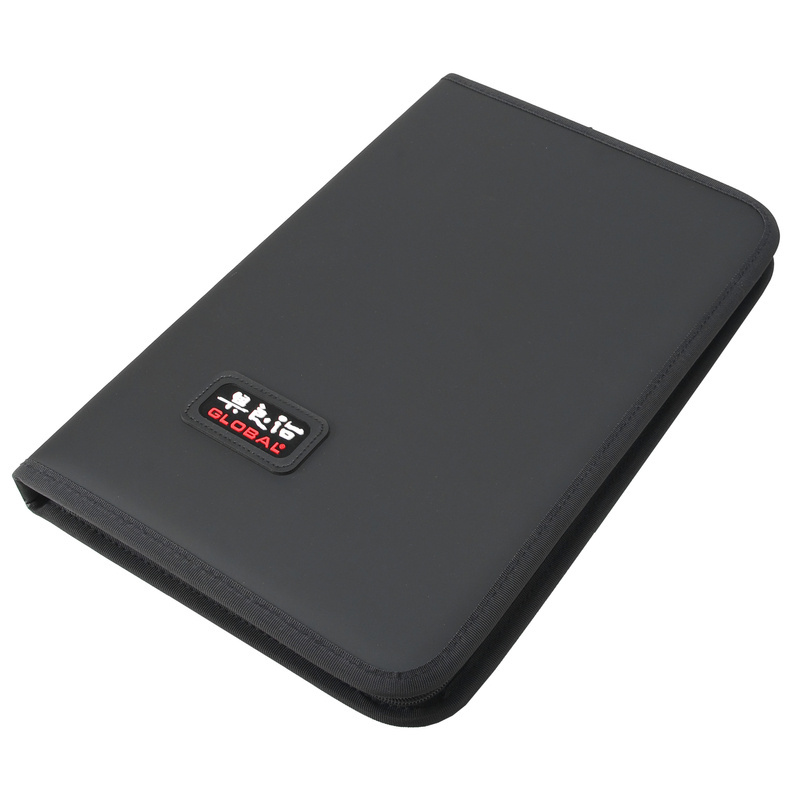 Elegancka, zamykana na suwak teczka firmy Global pozwala bezpiecznie i łatwo transportować noże kuchenne. Doskonale się też sprawdza jako wygodny sposób na przechowywanie noży w miejscu pracy. W teczce Global znajduje się siedem różnych kieszeni na noże o ostrzach, których długość nie przekracza 20 cm. Teczkę wykonano z czarnego, odpornego na przedarcia nylonu, który łatwo się czyści za pomocą wody z łagodnym detergentem. Solidny zamek błyskawiczny pomaga chronić zawartość teczki przez cały czas.