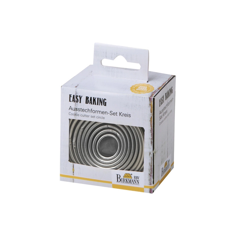 Zestaw 10 okrągłych foremek - niezbędnik dla każdego domowego cukiernika Zestaw foremek wykonanych ze stali nierdzewnej - do wykrawania ciasteczek i ozdób w kształcie idealnie okrągłych kółek - w 10 różnych rozmiarach - od 1.5 do 7 cm. Foremki posiadają ostre krawędzie do wycinania ciasta oraz zaokrąglone brzegi, zapewniające bezpieczeństwo dłoniom, podczas wycinania kółek. Idealne do pierniczków, maślanych ciasteczek, deserów z galaretek, czekolady, biszkoptu oraz do wycinania okrągłych ozdób z lukru plastycznego i owoców. Można myć w zmywarce, na górnej półce. Motto produktów z kolekcji Easy Baking to prostota: jajka, masło, cukier i mąka – to podstawowe składniki do pieczenia. Mając je, do osiągnięcia celu brakuje jeszcze tylko odpowiedniej formy do pieczenia! Wszystkie formy Easy Baking zostały wyposażone w niezwykle wytrzymałą powłokę nieprzywieralną, wytwarzaną przez znaną firmę Whitford. W skład kolekcji wchodzą m. in.: tortownice, keksówki, formy do babek oraz wszystkie inne, niezbędne akcesoria do pieczenia.