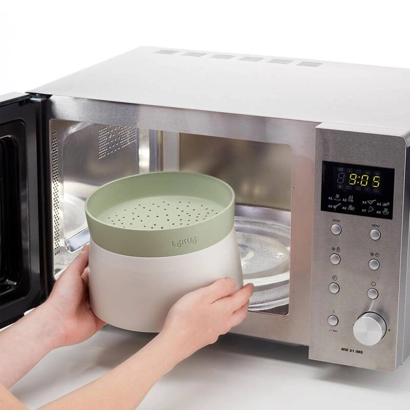 Naczynie do przygotowywania quinoli, kaszy, ryżu w kuchence mikrofalowej Prosto, szybko, bez brudzenia dużej ilości naczyń Nie potrzeba garnka, durszlaka, miski. Zamiast tego można użyć jednego naczynia hiszpańskiej firmy Lekue. Zostało ono stworzone z myślą o ludziach zabieganych, mających mało czasu i mało miejsca w kuchni oraz lubiących zdrowe odżywianie Naczynie jest przeznaczone do gotowania każdego rodzaju ryżu, komosy i kasz. Producent wymienia 7 rodzajów kasz i 7 rodzajów ryżu. Czas gotowania zależy od mocy kuchenki mikrofalowej (przyjmuje się moc 800W). W dołączonej instrukcji znajdują się zdjęcia oraz ikonografika, która wyjaśnia szczegółowo jak przyrządzić wiele rodzajów kasz i ryżu, jakiej ilości wody użyć w zależności od tego dla ilu osób ma być przygotowana potrawa. Przyjmuje się, że porcja dla jednej osoby to 60 g ziaren. W instrukcji znajduje się również kilka łatwych przepisów na gotowe potrawy. Przepisy przedstawione są w prosty sposób. W punktach, za pomocą zdjęć i ikon. Po umieszczeniu pokrywy na naczyniu, wstawić do kuchenki (moc 800W). Gotować według czasu podanego na opakowaniu produktu i instrukcji Lekue oraz preferencji smakowych. Wyjąć z kuchenki używając rękawicy ochronnej. Przemieszać ziarna i zostawić na 3 minuty, odcedzić resztę wody, zdjąć pokrywę, serwować. Produkt wolny od BPA. Można myć w zmywarce.