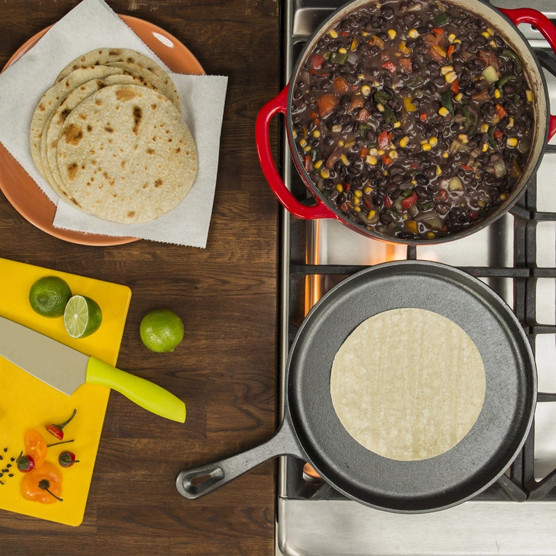 Trwałe, solidne, na lata - naczynia żeliwne Lodge Nie boją się uszkodzeń, nie boją się ognia Duża, płytka patelnia idealna do przygotowywania naleśników, pizzy, quesadillas. Posiada nachylone, niskie boki dla łatwiejszego obracania potrawy i zsuwnia gotowej z patelni. Naczynia żeliwne to tradycyjne, często przekazywane z pokolenia na pokolenie wyposażenie kuchni. Chętnie używane są zarówno przez kucharzy amatorów jak i profesjonalistów. Naczynia wykonane z żeliwa: równomiernie się nagrzewają i długo utrzymują temperaturę - są energooszczędne przyjazne dla środowiska można używać na każdym źródle ciepła - kuchenka: gazowa, elektryczna, ceramiczna, indukcyjna; piekarnik, otwarty ogień, grill. Nie używać w kuchence mikrofalowej. świetnie nadają się do serwowania potraw bezpośrednio na stół uwaga: rączki nagrzewają się. Konieczne jest użycie rękawic lub specjalnych uchwytów chroniących dłonie przed poparzeniem. Patelnię należy myć ręcznie.
