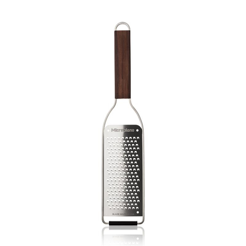 Elegancja plus niezawodność Tarka o średnio grubym ostrzu typu COARSE w nowej odsłonie - doskonała jakość ostrza w połączeniu z drewnianym wykończeniem Polecana do twardego sera, imbiru, czosnku , cebuli, marchewki, kokosa, cytrusów, papryczek , kory cynamonu, gałki muszkatołowej. nierdzewne, stalowe ostrze wyprodukowane w USA uchwyt wykonany z drewna orzechowego z Kentucky gumowe końcówki zabezpieczające przed zarysowaniem blatu ochraniacz na ostrze - w komplecie Z tarkami Microplane ścieranie, dotychczas męczące, teraz nie wymaga użycia dużej siły i staje się przyjemne. Zapewniają to: wygodny uchwyt, idealnie pasujący do dłoni, lekkość narzędzi i ich niezwykła ostrość. Ścierany produkt nie jest rozrywany ani strzępiony, zachowuje smak i aromat. Sekret ostrości tarek Microplane tkwi w autorskiej technologii fototrawienia, w której do uzyskiwania powierzchni tnących wykorzystuje się środki chemiczne. Produkt opakowany w efektowne, kartonowe pudełko - świetnie nadaje się na prezent. Należy myć ręcznie. Kolekcja MASTER - to połączenie jakości i elegancji. Niezawodne ostrza Microplane połączono z drewnem orzechowym z Kentucky.