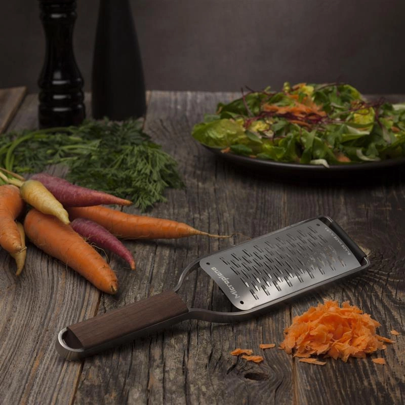 Są tarki i są tarki Microplane. Do starcia dużej ilości selera naciowego zawsze używałem robota kuchennego co było niepotrzebną komplikacją - powstające podczas tarcia włókna skutecznie blokowały otwory w każdej tarce. Problem zniknął po zakupie tej tarki - wszystko jest ścierane błyskawicznie, włókna nawet nie mają szansy oddzielić się od łodygi. W tym wypadku ręczne ścieranie na tarce Microplane jest łatwiejsze niż użycie robota kuchennego. Warte swojej ceny!