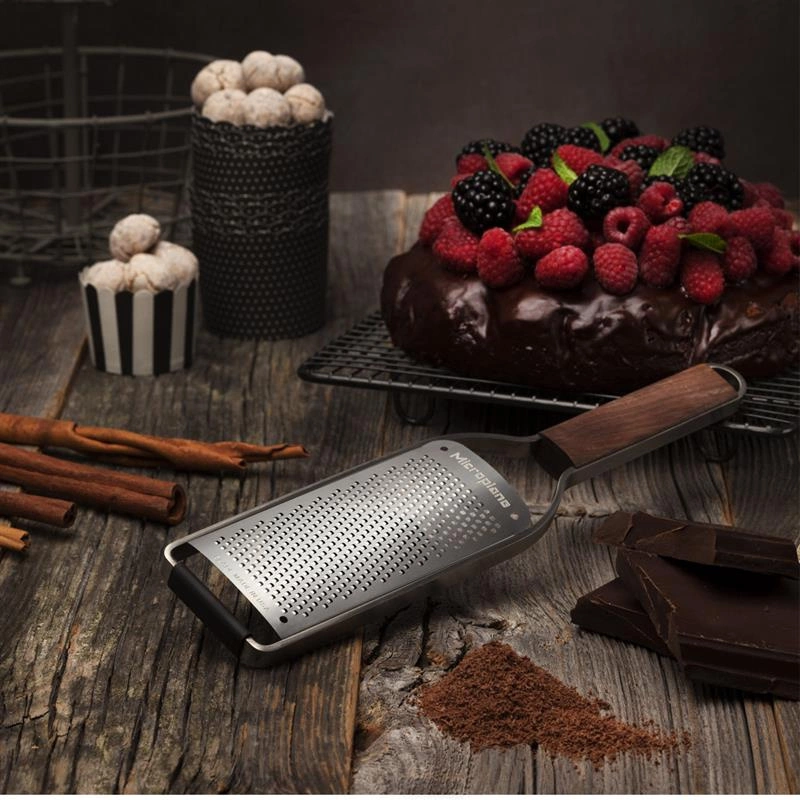 Elegancja plus niezawodność Tarka do ścierania na drobno typu FINE w nowej odsłonie - doskonała jakość ostrza w połączeniu z drewnianym wykończeniem Polecana do twardego sera, czekolady, kory cynamonu, gałki muszkatołowej, imbiru, papryki, marchwi, cytrusów. nierdzewne, stalowe ostrze wyprodukowane w USA uchwyt wykonany z drewna orzechowego z Kentucky gumowe końcówki zabezpieczające przed zarysowaniem blatu ochraniacz na ostrze - w komplecie Z tarkami Microplane ścieranie, dotychczas męczące, teraz nie wymaga użycia dużej siły i staje się przyjemne. Zapewniają to: wygodny uchwyt, idealnie pasujący do dłoni, lekkość narzędzi i ich niezwykła ostrość. Ścierany produkt nie jest rozrywany ani strzępiony, zachowuje smak i aromat. Sekret ostrości tarek Microplane tkwi w autorskiej technologii fototrawienia, w której do uzyskiwania powierzchni tnących wykorzystuje się środki chemiczne. Produkt opakowany w efektowne, kartonowe pudełko - świetnie nadaje się na prezent. Należy myć ręcznie. Kolekcja MASTER - to połączenie jakości i elegancji. Niezawodne ostrza Microplane połączono z drewnem orzechowym z Kentucky.