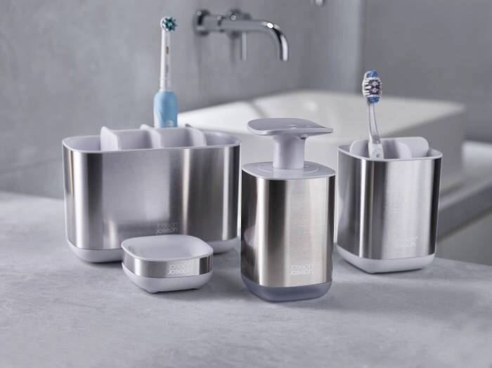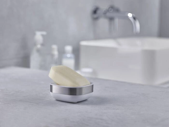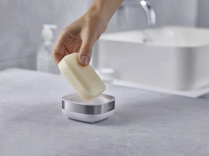 - konstrukcja korpusu mydelniczki jest pochylona, dzięki czemu mydło ułożone pod kątem szybciej obsycha, a mydelniczka zajmuje mniej miejsca,