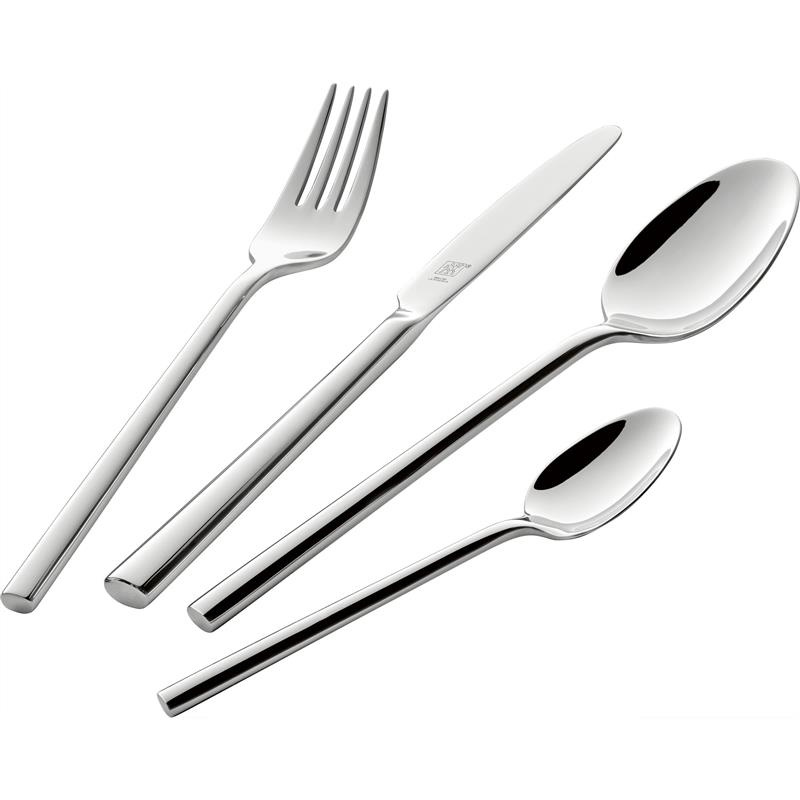 12 noży obiadowych, 12 widelców, 12 łyżek, 12 łyżeczek do kawy, 12 widelców do ciasta, 1 łyżkę do zupy, 2 widelce do mięsa, 2 łyżki do serwowania, 1 łyżka do sosu, 1 łopatka do ciasta, 1 łyżeczka do cukru.