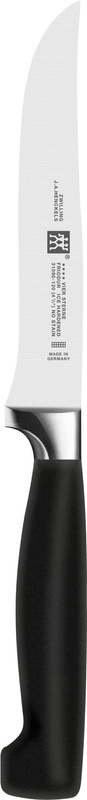 W każdej funkcjonalnej kuchni niezbędnym wyposażeniem są ostre i niezawodne noże kuchenne. Tę funkcję z powodzeniem spełnią wysokiej jakości akcesoria niemieckiej firmy Zwilling. Noże Zwilling od lat zaspokajają wymagania zarówno doświadczonych szefów kuchni, jak i kameralnych, domowych mistrzów kulinarnych. Elegancki design oraz wyjątkowa solidność noży Zwilling gwarantują zadowolenie klientów na całym świecie. Unikalna metoda utwardzania stali FRIODUR® zapewnia wyjątkową trwałość i odporność na korozję. Noże wytwarzane są z najlepszych materiałów i przy zastosowaniu nowoczesnej technologii SIGMAFORGE®. Wygodę użytkowania zapewnia również znakomite wyważenie każdego egzemplarza. Seria noży Zwilling Four Star to klasyczny styl. Linia ta powstała ponad 30 lat temu i do dziś cieszy się niezmiennym uznaniem klientów. RĘKOJEŚĆ NOŻA ???? ®FOUR STAR materiał odporny na uszkodzenia mechaniczne gładka, ergonomiczna rączka w kolorze czarnym idealne łączenie rękojeści i ostrza, bez zgrubień OSTRZE NOŻA ???? ®FOUR STAR wytworzone ze znakomitej, wysokowęglowej stali gwarancja nierdzewności starannie naostrzone pod kontrolą technologii laserowej elastyczne naostrzone na całej długości, od nasady aż po czubek noża WYMIARY