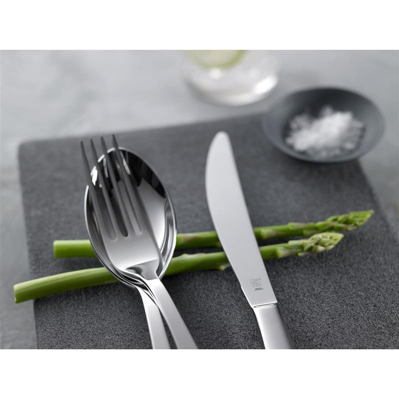 68-częściowy zestaw sztućców Zwilling Greenwich to wszystko, czego można chcieć pod względem projektu i grubości materiału. Każdy z elementów ma smukłą sylwetkę i subtelnie zakrzywiony koniec rękojeści. Zestaw sztućców obejmuje łyżki obiadowe, widelce, noże, łyżeczki do kawy i widelce do ciasta dla 12 osób. Ponadto zawiera on łyżkę do nakładania zup, widelec do mięsa i dwie łyżki do serwowania sałatek. Zestaw zawiera również łyżeczkę cukru, serwatkę do ciast i dwie łyżki sałatkowe i do serwowania deserów i dodatków. Zestaw sztućców ZWILLING Greenwich z matowym wykończeniem zapewnia przybory kuchenne na każdą okazję.