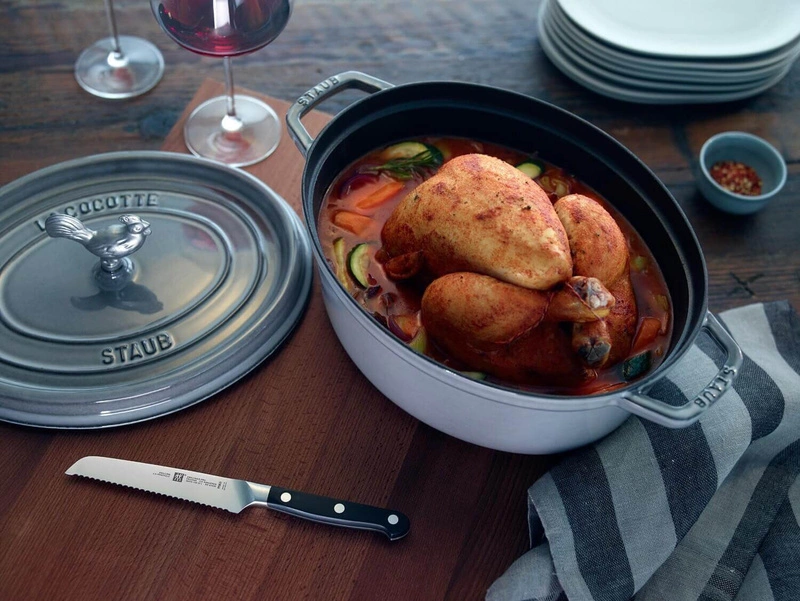 W każdej funkcjonalnej kuchni niezbędnym wyposażeniem są ostre i niezawodne noże kuchenne. Tę funkcję z powodzeniem spełnią wysokiej jakości akcesoria niemieckiej firmy Zwilling. Noże Zwilling od lat zaspokajają wymagania zarówno doświadczonych szefów kuchni, jak i kameralnych, domowych mistrzów kulinarnych. Elegancki design oraz wyjątkowa solidność noży Zwilling gwarantują zadowolenie klientów na całym świecie. Produkty linii Zwilling Pro zaprojektowane zostały przez włoskiego architekta, Matteo Thuna. Charakteryzują się prostotą wzornictwa i niezwykłą trwałością. Są one wytwarzane z najlepszych materiałów i przy zastosowaniu nowoczesnej technologii SIGMAFORGE®. Wygodę użytkowania zapewnia również znakomite wyważenie każdego egzemplarza. Dopiero zaczynasz swoją przygodę z gotowaniem? Jeśli nie jesteś jeszcze pewny czym chcesz się zajmować, polecamy nóż uniwersalny z serii ZWILLING® Pro od firmy Zwilling. Bez problemu może on pełnić każdą niezbędną w kuchni rolę. Nóż stworzony został ze specjalnie dobranej stali nierdzewnej. Specjalnie ukształtowane ostrze zapewnia wysoki komfort pracy. Poddano je procesowi utwardzania lodem, dzięki czemu zachowuje ono odporność na korozję oraz ostrości przez długi czas. Trzynastocentymetrowe ostrze idealnie nada się zarówno do krojenia, wykrawania czy obierania. Nóż wyposażono także w wygodnych uchwyt z tworzywa sztucznego, który nie męczy dłoni nawet przy długim użytkowaniu. Nie ma także ryzyka, że wyśliźnie się on spomiędzy palców – bezpieczeństwo przede wszystkim. Nóż uniwersalny firmy Zwilling sprawdzi się w każdej sytuacji. Niezależnie od zadania, które mu powierzysz – nie zawiedziesz się. To nieoceniona pomoc dla każdego, kto nie wyposażył jeszcze swojej kuchni w specjalistyczne narzędzia, ale chciałby już teraz poeksperymentować. RĘKOJEŚĆ NOŻA ZWILLING® PRO gładka, idealnie wypolerowana rączka w kolorze czarnym twardy materiał, odporny na uszkodzenia mechaniczne 3 nity, zapobiegające rozdzieleniu rączki od ostrza łączenie rękojeści i ostrza idealnie gładkie, bez zgrubień OSTRZE NOŻA ZWILLING® PRO wytworzone ze znakomitej, wysokowęglowej stali FRIODUR® gwarancja nierdzewności starannie naostrzone pod kontrolą technologii laserowej elastyczne ostre na całej długości, od nasady aż po czubek noża WYMIARY Produkt dostępny w rozmiarze 13 cm.