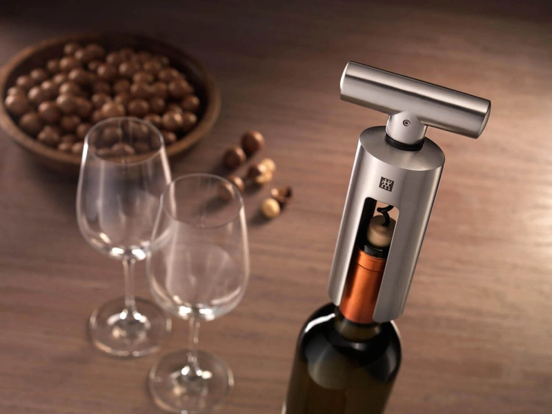 Wygodny, pionowy korkociąg wykonany z satynowanej stali. Wzmocniona, hartowana sprężyna. Eleganckie opakowanie o wymiarach 190 x 115 x 50 mm – przyrząd idealnie nadaje się na prezent.