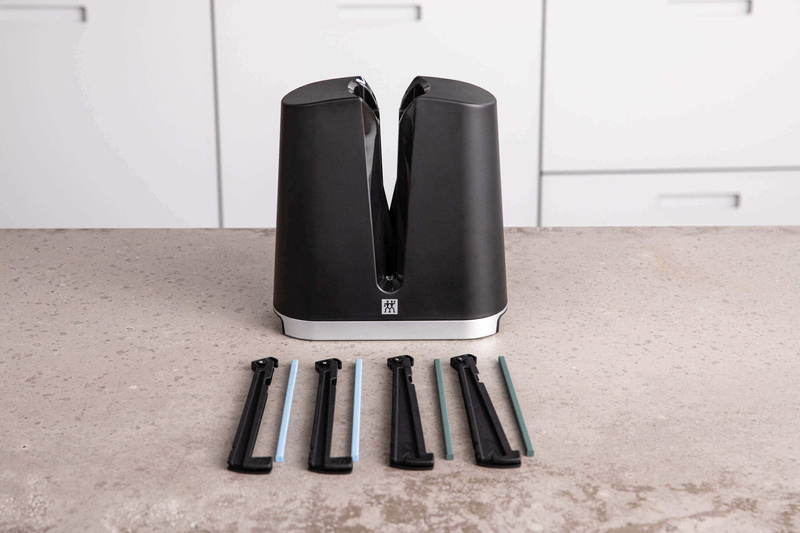 WŁAŚCIWOŚCI: tnące. Utrzymanie jakości w przypadku noży jest jednym z najistotniejszych czynników umilających codzienną pracę w kuchni. Kluczowy jest szlif. Ale zanim zaintrygowany tematem zaczniesz przeszukiwać najdalsze zakątki Internetu, spokojnie przeczytaj tekst do końca. Ostrzałka do noży Zwilling V-Edge gwarantuje profesjonalne ostrzenie w domowych warunkach. Jej mechanizm ostrzący jest ekstremalnie prosty i absolutnie efektywny. Ostrze prawidłowo szlifowanego noża powinno od dołu do góry układać się w literę V. Dzięki ukształtowanym w ten sposób kamieniom ceramicznym szlifowane jest ono równo na całej długości bez ryzyka uszkodzenia. Dla noży europejskich i japońskich dostępne są wymienne adaptery o różnych kątach, które, jeśli akurat nie są używane, mogą być przechowywane w wygodnym schowku u spodu urządzenia. Ich wymiana jest banalnie prosta i nie wymaga pomocy specjalisty. Poza niezwykłą funkcjonalnością, ostrzałka V-Edge odznacza się niepowtarzalnym designem i najwyższą jakością wykonania, dzięki czemu już na pierwszy rzut oka widać, że jest naprawdę dobrym narzędziem. Zamiast za każdym razem chować ją do szafy, może stać na blacie urozmaicając i zdobiąc wyposażenie każdej kuchni, będąc pod ręką podczas przygotowania wszystkich codziennych posiłków. Dzięki ostrzałce Zwilling V-Edge Wasze noże zawsze będą profesjonalnie naostrzone, ciesząc przy każdym użyciu.