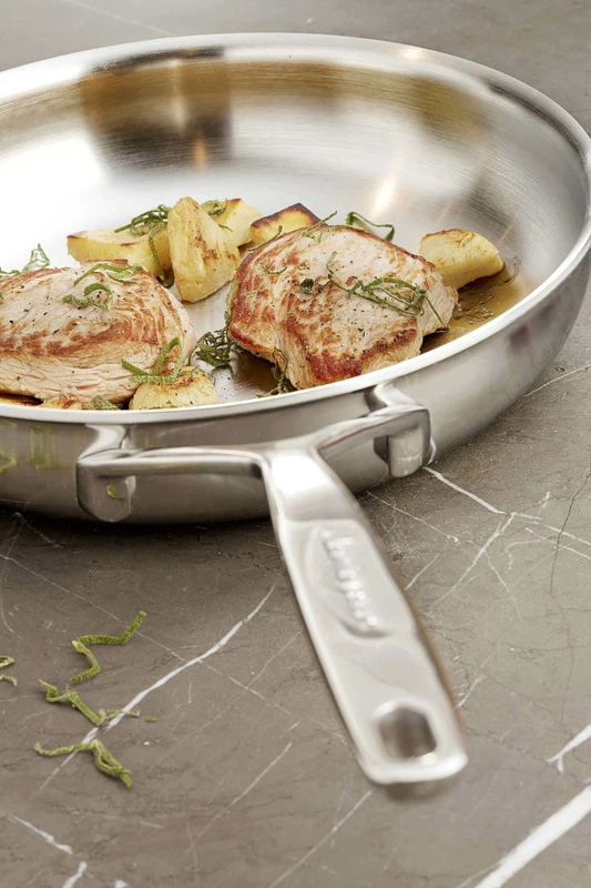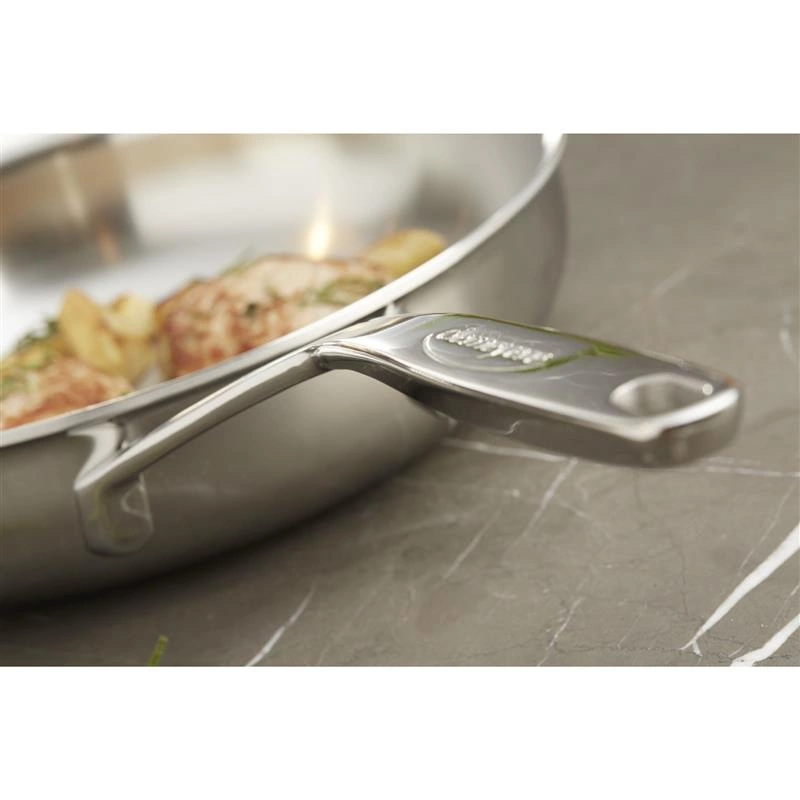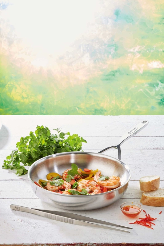 7-warstwowa stal szlachetna połączona z aluminium sprawia, że temperatura rozchodzi się szybko i równomiernie. Dla ułatwienia pracy patelnia wyposażona została w wygodny, poręczny uchwyt, który nawet przy wysokich temperaturach pozostaje przyjemnie chłodny. Specjalna powłoka Silvinox®, będąca niemalże znakiem rozpoznawczym marki Demeyere, umożliwia łatwe i szybkie czyszczenie oraz zapobiega przebarwieniom czy pozostawaniu odcisków palców, jednocześnie nadając naczyniu srebrzysty połysk. Stalowa patelnia Demeyere Multiline to pomocnik, który swoją funkcjonalnością i ponadczasowym wyglądem cieszyć będzie przez długie lata.