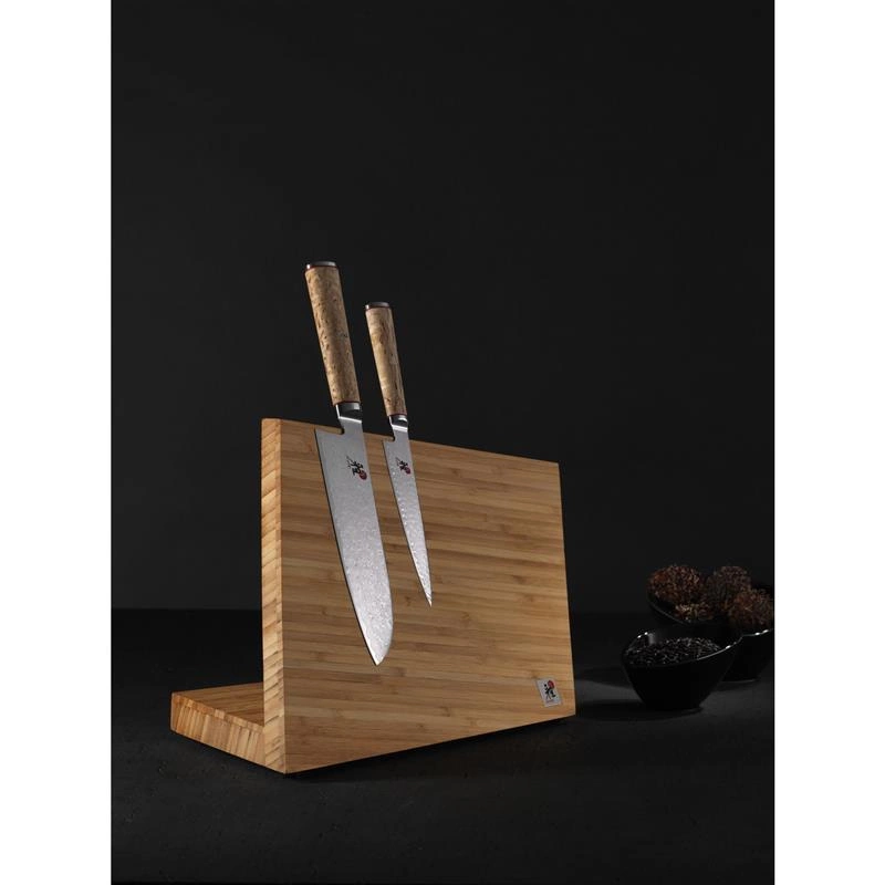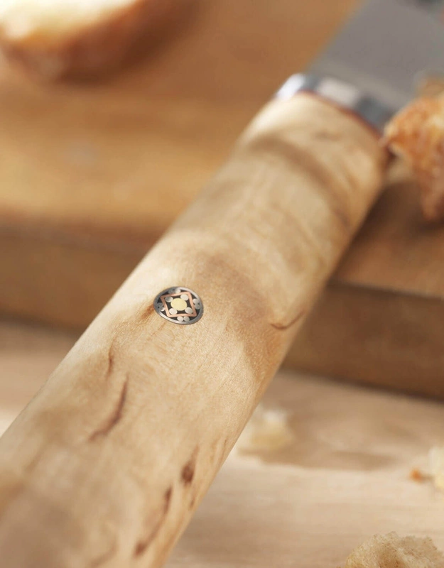 Od samego ostrza aż po uchwyt nóż SANTOKU jest unikatowy: naturalna struktura rękojeści uzyskana poprzez zastosowanie drewna brzozy Masur nadaje narzędziu wyjątkowy wygląd. Szlifowane drewno uformowane w typowy dla japońskich noży kształt litery D gwarantuje precyzję i krojenie bez cienia zmęczenia. Całość dopełniają stylowe detale takie jak filigranowe, mozaikowe logo linii. Prosty wygląd noża dodatkowo podkreśla jego funkcjonalność: dzięki nożowi SANTOKU marki Miyabi nawet praca nad rybami, mięsami czy cięższymi warzywami stanie się lekka i przyjemna.