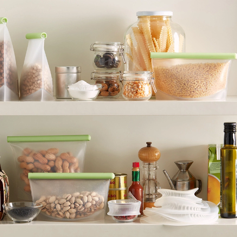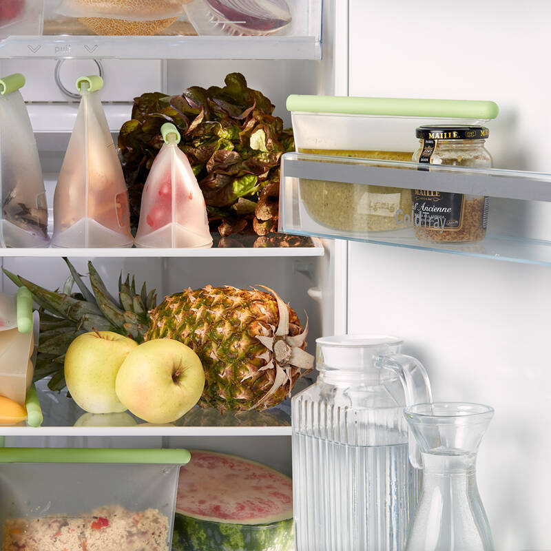 EKOLOGICZNA ALTERNATYWA DLA FOLIOWYCH WORECZKÓW I JEDNORAZOWYCH POJEMNIKÓW NA ŻYWNOŚĆ Wielorazowe woreczki hermetyczne Lekue są doskonałą alternatywą dla foliowych i plastikowych opakowań jednorazowego użytku. Pokochają je miłośnicy życia w duchu Zero Waste Są trwałe i można je wykorzystywać na wiele sposobów. • Idealne do przechowywania żywności w lodówce, zamrażarce lub na półkach, do rozmrażania produktów w kuchence mikrofalowej (bez klamry uszczelniającej), a także do pakowania produktów sprzedawanych luzem. • 100% szczelności dzięki zastosowaniu specjalnej klamry, co pozwala na hermetyczne przechowywanie produktów spożywczych. • Przechowywanie pełnych woreczków zarówno w pozycji pionowej, jak i poziomej. • Odpowiednie do przechowywania każdego rodzaju produktów - sypkich, stałych i płynnych. • Na woreczkach wskazany jest maksymalny poziom wypełnienia oraz specjalne miejsce do zapisania daty, pozwalające na kontrolę świeżości produktów. Silikon Platinum, z którego wykonane są woreczki to materiał najwyższej jakości. To z tego tworzywa wykonywane są smoczki dla niemowląt. Klamry uszczelniające wykonano z tworzywa ABS. Produkt wolny od BPA, nadaje się w 100% do recyklingu. Można myć w zmywarce.