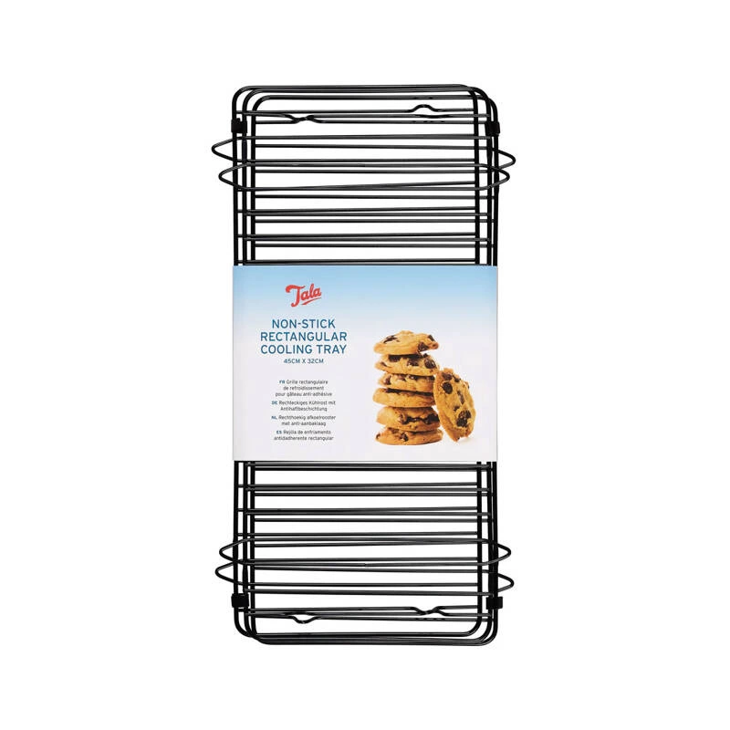OSZCZĘDNOŚĆ MIEJSCA PODCZAS PRZECHOWYWANIA Trwała i solidnie wykonana, z podwójną powłoką nieprzywieralną Złożona kratka podczas przechowywania zajmuje niewiele miejsca, bo zaledwie 1/3 swej długości po rozłożeniu. Stopki utrzymują kratkę nad blatem, umożliwiając cyrkulację powietrza i odprowadzanie gorącej pary z wypieków. W przypadku bardzo delikatnych wypieków zaleca się wyłożenie ich papierem do pieczenia lub pergaminem, aby nie uszkodzić powierzchni ciasta. Można myć w zmywarce. Tala to jedna z najstarszych (istnieje od 1899 r.) i najbardziej cenionych przez kucharzy marek brytyjskich produkujących akcesoria do pieczenia. czarny23 x 43 cm [sz. x dł.]