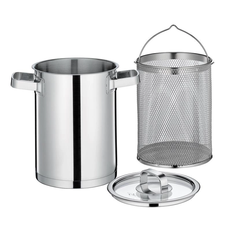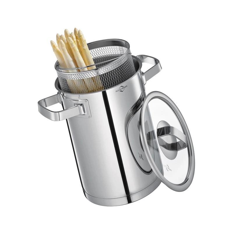 Garnek z wkładem do gotowania szparagów niemieckiej marki Kuchenprofi z serii San Remo. Wielowarstwowe dno przystosowane jest do wszystkich rodzajów kuchenek, włącznie z indukcyjnymi.