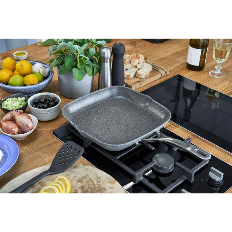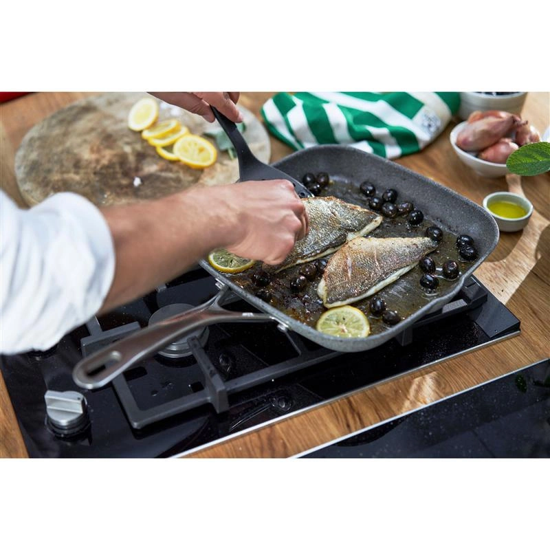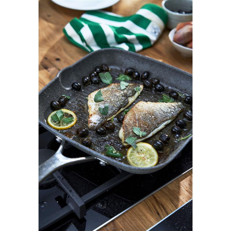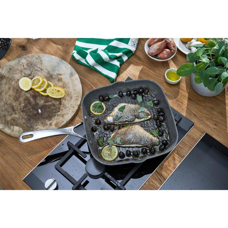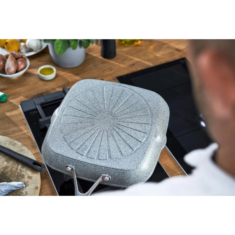 Patelnia wykuta została z litego aluminium i niezwykle szybko się nagrzewa. Umieszczone w spodzie patelni rowki grillowe nie tylko nadają potrawom atrakcyjny wygląd, ale też sprawiają, że przygotowywane produkty nie „topią się” w oleju czy tłuszczu. Dzięki 6-warstwowej powłoce antyadhezyjnej GRANITIUM-Ti-X wzmocnionej tytanem naczynie jest trwałe i odporne na zarysowania. Ergonomiczne uchwyty z najwyższej stali nierdzewnej tak, aby podczas grillowania nie nagrzewać się, pozostając cudownie chłodnymi. Całość dopełnia elegancki granitowy wygląd zaprojektowany przez pochodzące z Mediolanu studio Matteo Thun & Antonio Rodriguez.