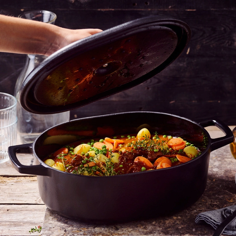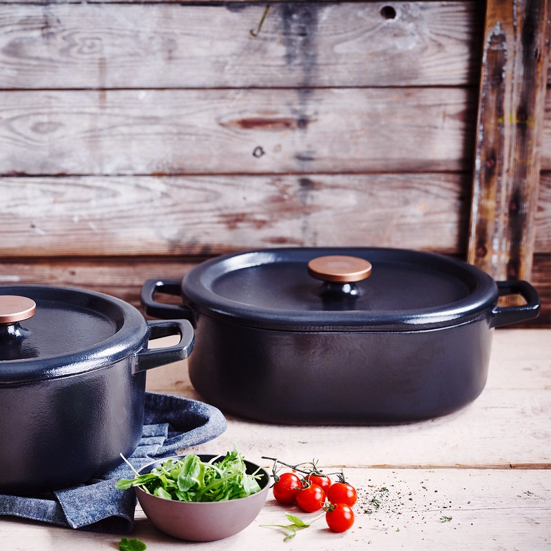 Wytrzymałe żeliwo doskonale przewodzi ciepło i długo je zatrzymuje. Wewnątrz i na zewnątrz naczynia żeliwnego nałożone są trzy warstwy emalii.