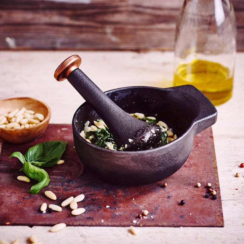 Wykonany z wytrzymałego żeliwa z szorstkim wykończeniem ułatwiającym prawidłowe rozdrabnianie ziół.