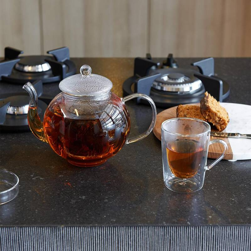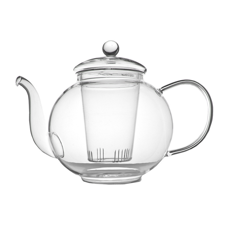 Szklany, elegancki dzbanek do herbaty liściastej. Wykonany ze szkła borokrzemowego, które ma dłuższą żywotność niż większość rodzajów szkła i jest odporne na wysokie temperatury. Można go używać wraz z podgrzewaczem na tealighty. Wewnątrz dzbanka znajduje się szklany zaparzacz. Można myć w zmywarce. Pojemność: 1,5 litra (6 filiżanek).