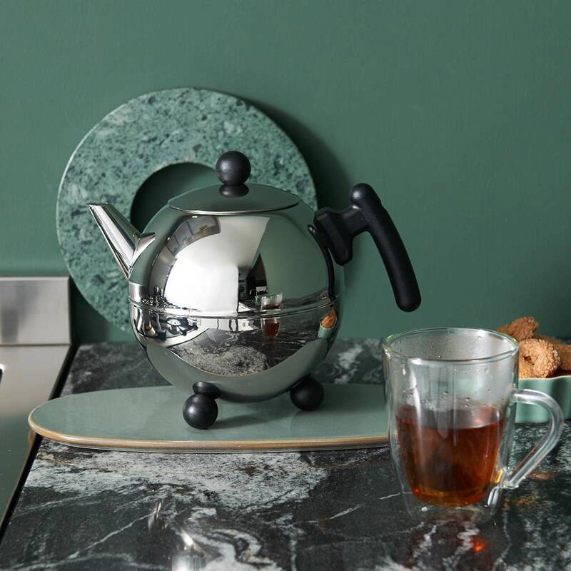 Dzbanek termiczny w kształcie kuli trzymający temperaturę herbaty, wykonany jest z nierdzewnej stali z polerowanej stali z czarnymi elementami. Izolacja termiczna utrzymuje temperaturę napoju przez co najmniej godzinę. Przeznaczony dla 5-6 osób. Wykonanie dzbanka o takiej jakości wymaga ponad 100 różnych etapów procesu wytwórczego i wyjątkowego kunsztu rzemieślniczego. Uchwyt się nie nagrzewa, dzięki czemu używanie dzbanka jest bardzo bezpieczne. Zapakowany w prezentowe pudełko. Można myć w zmywarce. Do dzbanka można dokupić odpowiedni filtr/zaparzacz do parzenia mieszanek liściastych.