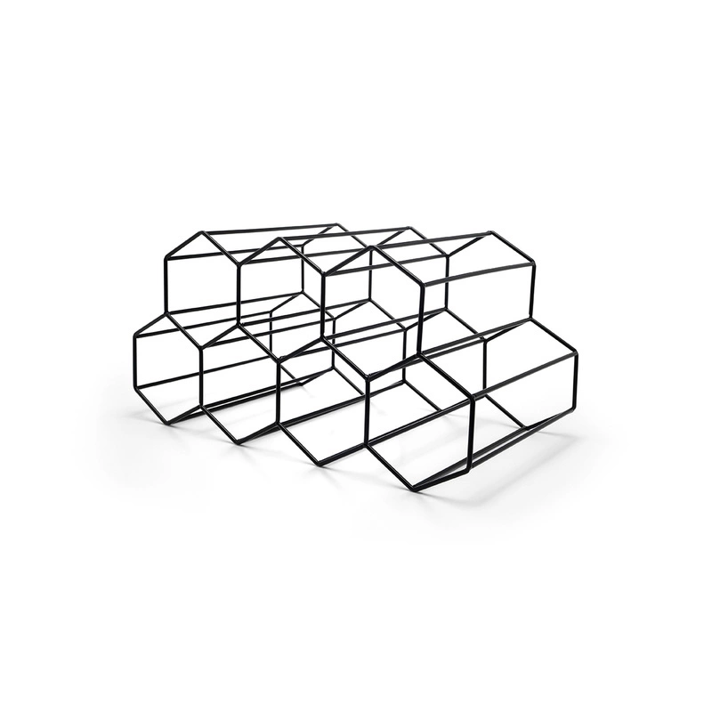 Nowoczesny stojak na wino pomieści 7 butelek. Wykonany jest ze stali w czarnym, matowym wykończeniu. Kształtem przypomina plaster miodu.