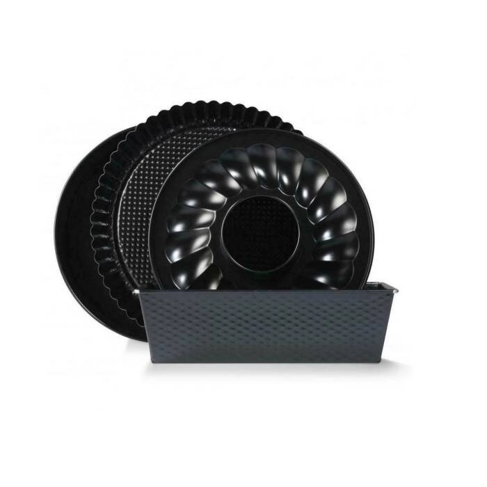 - zestaw do pieczenia: forma do tarty (śr. 28 cm), keksówka (dł. 25 cm) oraz tortownica (śr. 26 cm) z odpinaną obręczą i dwoma spodami: płaskim i do babki,