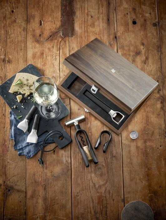 Pięcioelementowy zestaw sommelierski Baric firmy WMF to akcesoria doskonałe dla miłośników win. Stylowa skrzynka z drewna orzechowego skrywa podstawowe wyposażenie, które umili chwile przy każdym rodzaju wina.