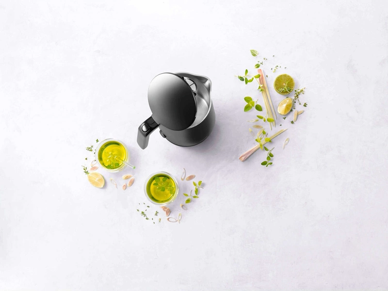 Bezspoinowy 1,5-litrowy pojemnik ze stali nierdzewnej jest łatwy w pielęgnacji, a zintegrowany filtr antywapienny – również częściowo z nierdzewnej stali szlachetnej - poprawia smak gotowanej wody. Precyzyjnie dopasowana pokrywa przysłania również dziobek, dzięki czemu nawet po przewróceniu naczynia ulatnia się z niego minimalna ilość wody.