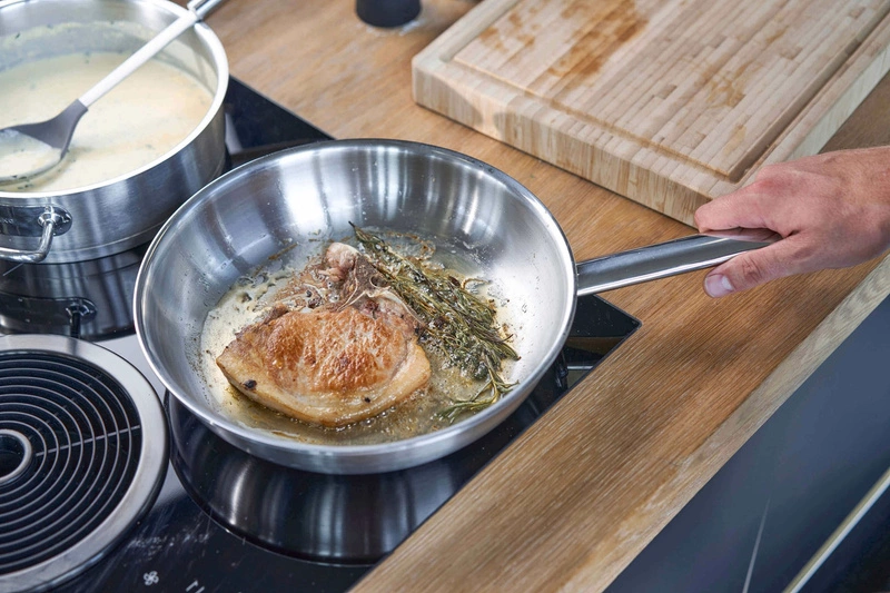 Powłoka patelni składa się z trzech warstw i jest szczególnie wytrzymała i trwała. Dzięki mocnemu aluminiowemu rdzeniu dna pokrytego powłoką SIGMA, patelnia ze stali nierdzewnej szybko się nagrzewa. Ciepło jest rozprowadzane bardzo równomiernie na krawędzi. Wolisz kuchenkę indukcyjną podczas gotowania? Nie ma problemu. Patelnię można używać na każdym rodzaju kuchenki i można ją myć w zmywarce. Dzięki temu masz mniej pracy i możesz w pełni skoncentrować się na swoich gościach.