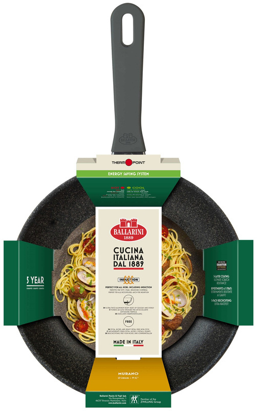 Patelnia z serii Murano marki Ballarini stanie się Twoją najbliższą kuchenną przyjaciółką. Smażenie, duszenie czy gotowanie okaże się codzienną przyjemnością. Jej piękny, granitowy design stworzony został przez wybitny duet projektantów Matteo Thun & Antonio Rodriguez. Patelnia jest odporna na zarysowania i łatwa w pielęgnacji dzięki specjalnej 5-warstwowej powłoce nieprzywierającej GRANITUM Extreme o grubości 4.5 mm. Bez obaw można ją czyścić w zmywarce, jednak dla zagwarantowania wyjątkowej trwałości zalecane jest mycie ręczne. Wysokiej jakości materiał wykonany z litego, kutego aluminium oszczędza cenny czas podczas nagrzewania.