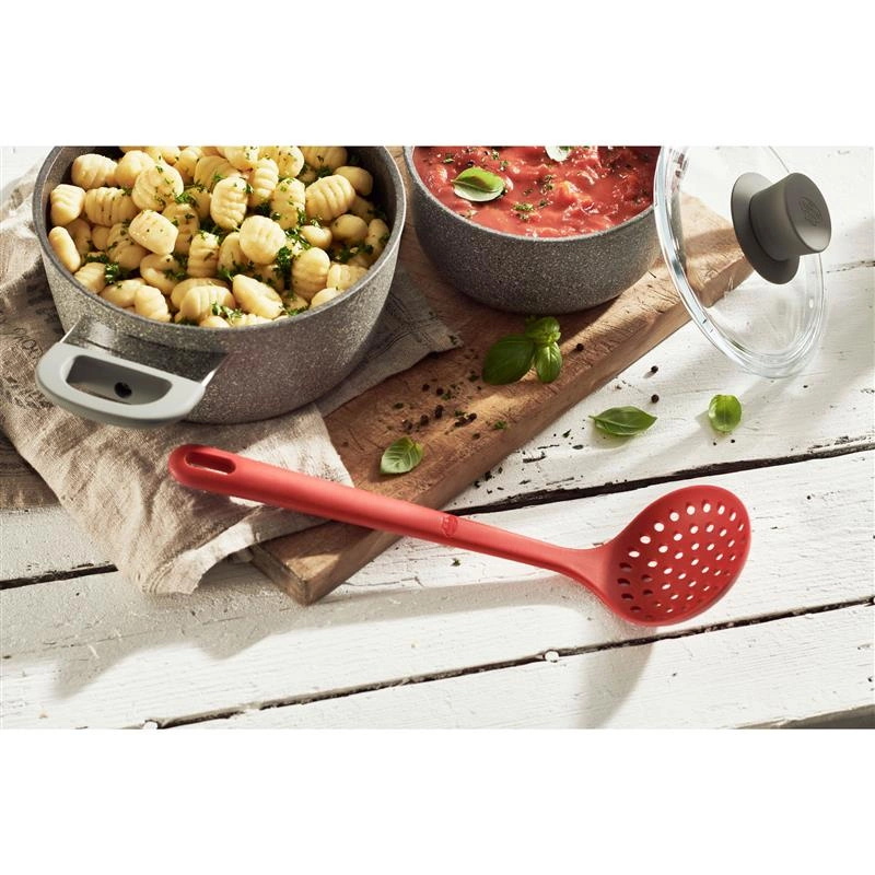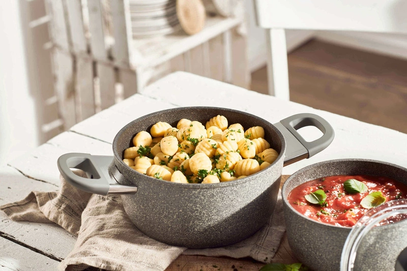 Naczynie wykonano z kutego aluminium i bez obaw czyścić je można w zmywarce, ale dla zagwarantowania jeszcze lepszych właściwości zaleca się mycie ręczne. Dzięki specjalnej, opracowanej przez Ballarini technologii indukcji promiennej garnek może być używany na wszystkich rodzajach kuchenek szybko i równomiernie rozprowadzając ciepło. Zarówno termoizolacyjne uchwyty Soft-Touch jak i powłoka imitująca granit pięknie się prezentują w modnym, szarym kolorze. Garnek zaprojektowany został w Mediolanie, a wyprodukowany we Włoszech i sprawia, że gotowanie staje się świetną zabawą. Przygotowanie aromatycznych sosów, słodkich deserów czy po prostu podgrzanie pyszności z poprzedniego dnia – znajdziesz dla niego zastosowanie dosłownie wszędzie!