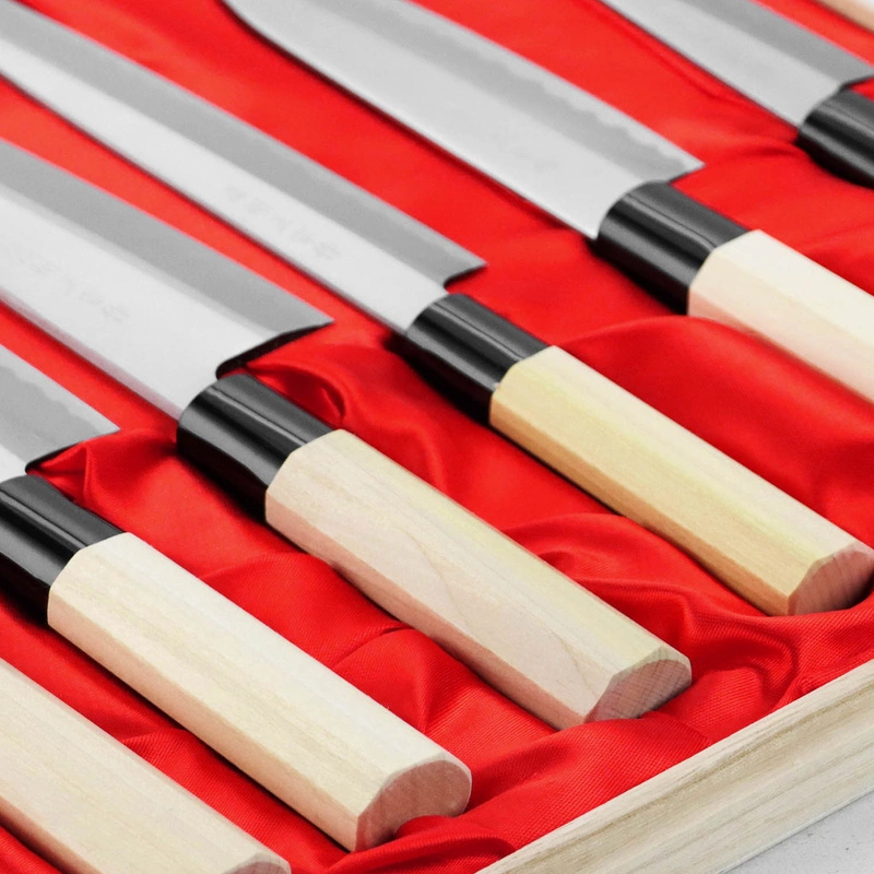 Zestaw 6 noży kuchennych w opakowaniu idealnie nadaję się na prezent. Noże wykonane z rdzewnej stali SK-5 hartowane do twardości 62 HRC, to świetny wybór dla każdego miłośnika stali rdzewnych.