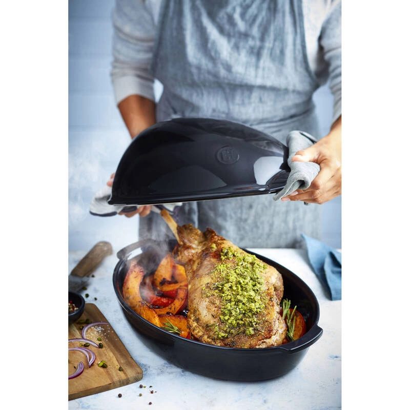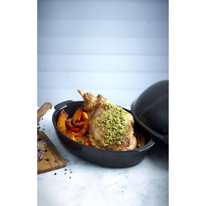Niezależnie od tego, czy jest to indyk, kurczak z wolnego wybiegu czy udziec jagnięcy, duże naczynie do pieczenia od Emile Henry pozwala na idealne przyrządzenie dużego drobiu czy pieczeni do 5 kg bez brudzenia piekarnika!