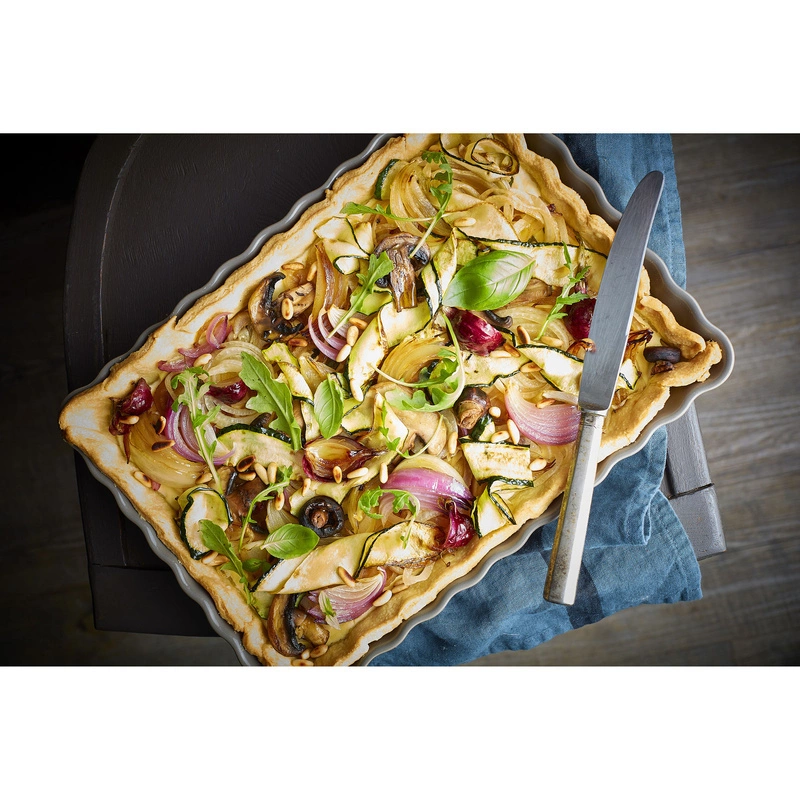 Prostokątne naczynie do tarty może być używane w kuchence tradycyjnej i mikrofalowej, można je bezpiecznie myć w zmywarce.