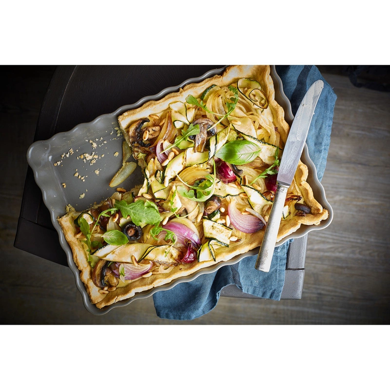 Prostokątne naczynie do tarty może być używane w kuchence tradycyjnej i mikrofalowej, można je bezpiecznie myć w zmywarce.