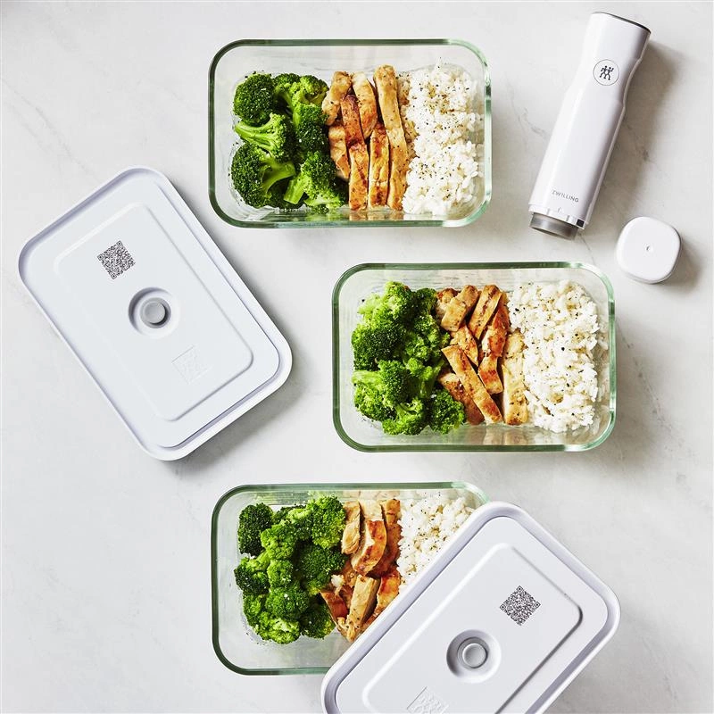 Pakowanie próżniowe – chłodzenie – śledzenie – przypominanie – radość - czym jeszcze może nas zaskoczyć ten niezwykły pojemnik próżniowy ZWILLING Fresh & Save? Na przykład tym, że nadaje się do użycia w zamrażarce, piekarniku, kuchence mikrofalowej i zmywarce. Dostępny jest w trzech rozmiarach: S, M oraz L, dzięki czemu może być idealnie dobrany do potrzeb i wielkości przechowywanych dań czy produktów. Pyszne zupy, chrupiące sałatki, a może coraz modniejsze, wieloskładnikowe bowle? W każdej chwili intensywnego tygodnia możesz cieszyć się smacznym, świeżym i zdrowym posiłkiem. Wystarczy jedno wciśnięcie przycisku, aby usunąć z wnętrza zbędne powietrze, gwarantując sobie znacznie dłuższą (nawet pięciokrotnie!) żywotność zawartości. Odporny na wysokie temperatury - nawet do 180 stopni - perfekcyjnie sprawdza się przy podgrzewaniu małych, pojedynczych porcji dań. A co ponadto? Innowacyjne rozwiązanie, łączące produkty za pomocą kodu QR ze specjalną, darmową aplikacją ZWILLING Culinary World App, umożliwiającą śledzenie oraz przypominającą omijającym terminie świeżości trzymanych dań. Pojemnik próżniowy ZWILLING Fresh & Save to naczynie, które ułatwi Ci codzienność umożliwiając zdrowe, świeże i regularne posiłki w ciągu całego dnia.