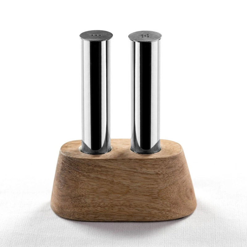 Przyprawnik składający się z solniczki i pieprzniczki wykonanych ze stali nierdzewnej i przechowywanych w drewnianej podstawce.
