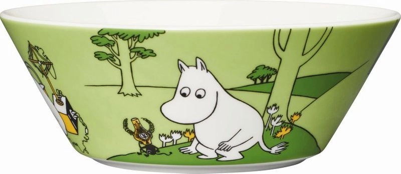 Miseczka Muminki Muminek zielony fińskiej marki Arabia z serii porcelany poświęconej postaciom z książek Tove Jansson. Autorka znanych i lubianych książek o Muminkach zaakceptowała pierwsze grafiki podczas powstawania muminkowej porcelany.