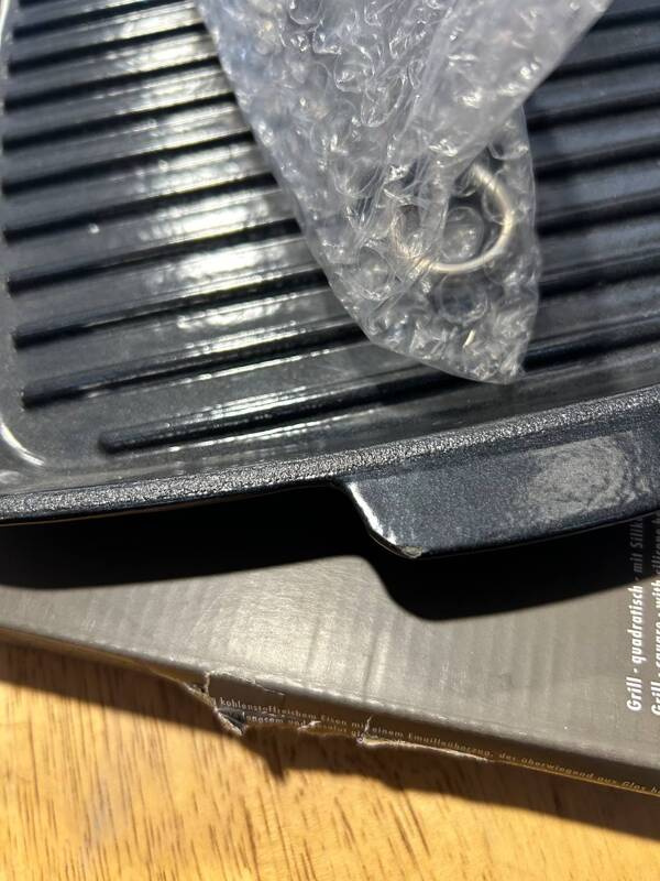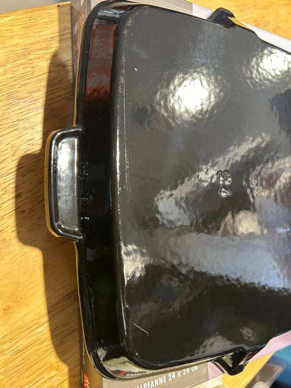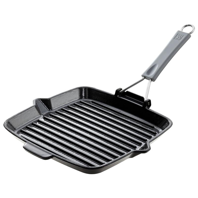 Żeliwna kwadratowa patelnia  firmy Zwilling . Na zewnątrz patelnia pokryta jest emalią chroniącą przed korozją, która nadaje niepowtarzalny, głęboki wygląd.
