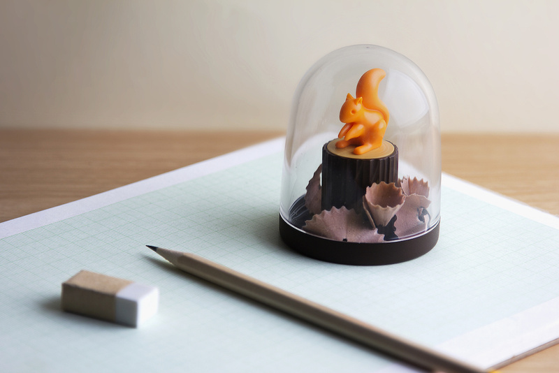Mała wiewiórka siedzi na ostrzałce do kredek i ołówków. Podczas ostrzenia drewnianego ołówka z pnia wychodzą kawałki drewna i gromadzą się wokół niego, symbolizując ścięte drzewa.