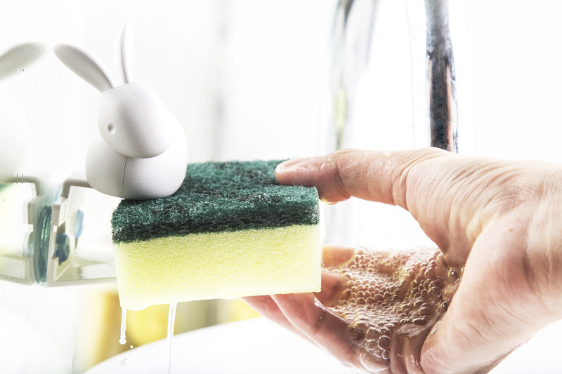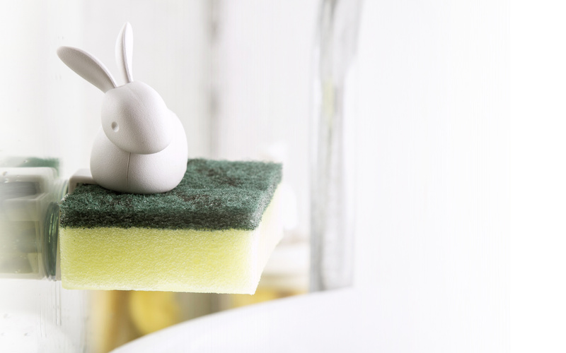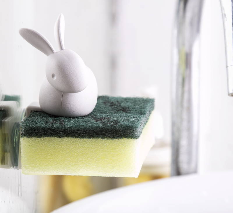 Ten mały króliczek pomoże w czyszczeniu. Dba o Twoją gąbkę, aby mogła wyschnąć, kiedy skończysz jej używać, i usiądzie na niej, dopóki nie będziesz jej potrzebować. Po prostu włóż gąbkę do uchwytu.