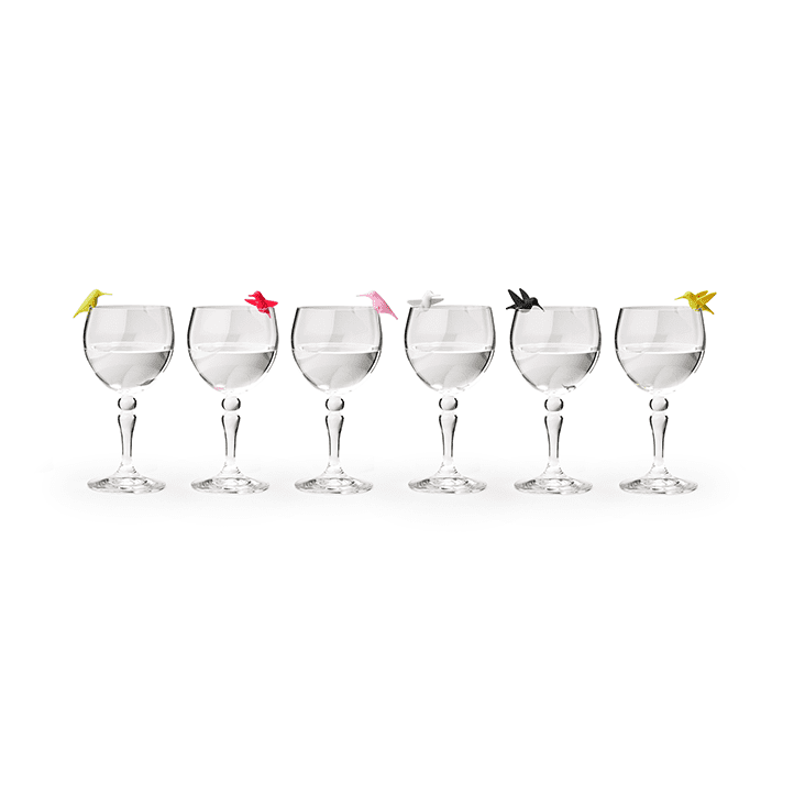 Zestaw 6 znaczników na szklanki Koliber. Znaczniki pozwolą każdemu z uczestników imprezy łatwo odróżnić, który kieliszek należy do niego. Znaczniki mocowane na górną krawędź szklanki. To nie tylko użyteczne gadżety, ale też zabawny element na każdej imprezie.