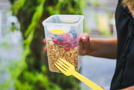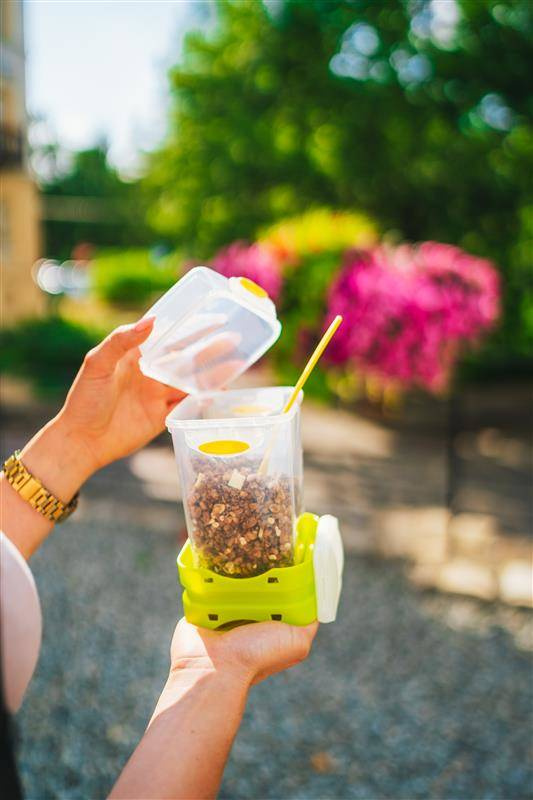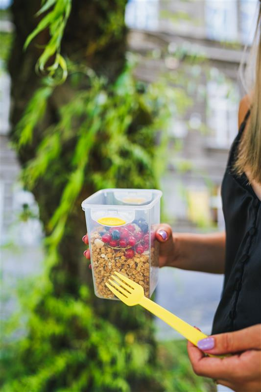 Nadaje się do podgrzewania w mikrofalówce (uchwyty są odporne na nagrzewanie, należy podgrzewać otwarty pojemnik). Nadaje się również do lodówki, zamrażarki i mycia w zmywarce. Lunchbox jest wolny od szkodliwych substancji, jak BPA.