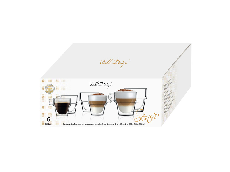 Nowoczesny i praktyczny zestaw 6 szklanek termicznych z podwójną ścianką serii Senso marki Vialli Design. W skład wchodzą po dwie filiżanki o pojemnościach 150ml, 280ml, 350ml.