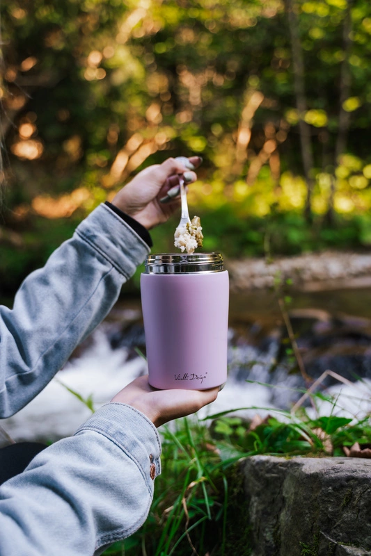 Termos obiadowy Vialli Design z serii Fuori ma pojemność 500 ml i oferuje stalową izolację próżniową – gwarantuje to zachowanie odpowiedniej temperatury przez długi czas. W przypadku gorących produktów będzie to 12 godzin, a w przypadku schłodzonych – aż 16 godzin. Bardzo dużym atutem jest to, że zewnętrzna ścianka nie nagrzewa się ani nie skrapla. Dobrze przemyślany kształt produktu, który idealnie dopasuje się do każdej dłoni, to kolejny aspekt świadczący o niezwykłej funkcjonalności. Kompaktowy rozmiar i niewielka waga sprawiają, że transport termosu nie będzie żadnym problemem – możemy z łatwością zabrać go na przykład do pracy.