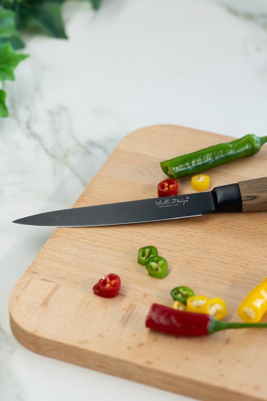 Ostrza wykonano z gatunkowej stali 1.4116 wyprodukowanej w Niemczech. Twardość ostrzy to 56 HRC. Takie parametry zapewniają równowagę między twardością noży a łatwym ostrzeniem. Ergonomiczny kształt rękojeści pozwala Ci stabilnie utrzymać narzędzie, co przekłada się na jakość wykonywanej pracy. Dzięki temu przygotujesz swoje potrawy z mistrzowską precyzją, którą osiągniesz bez zbędnego wysiłku. Pięcioletni okres gwarancji pozwoli Ci cieszyć się funkcjonalnym narzędziem przez długi czas.