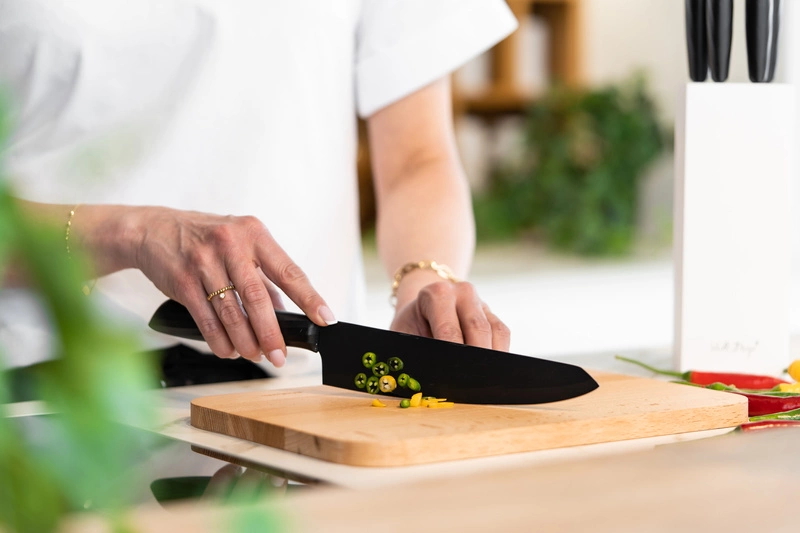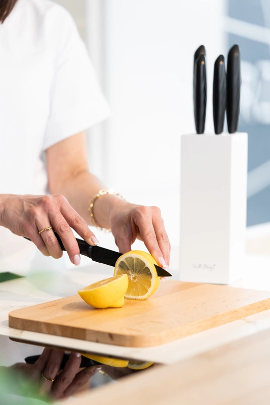 Dodatkowym elementem jest blok, w którym są zlokalizowane noże. W zależności od upodobań i wystroju Twojej kuchni możesz wybrać wariant czarny lub biały. Uniwersalna kolorystyka pozwala wkomponować zestaw w każdy wystrój.