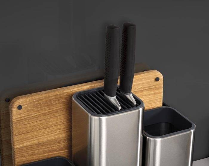 - zestaw kuchennych pojemników, w których można przechowywać noże oraz narzędzia: łyżki, szpatułki, obieraczki itp.,